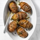 Place the potatoes in a greased baking dish. Brush the top of the potatoes with some of the olive oil mixture, getting bits of the thyme and garlic in between the slits.
