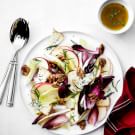 Trim the stem end from each head of endive and separate the leaves. (If the leaves are large, you can cut them in half crosswise.) In a large bowl, combine the endive, apple slices and tarragon leaves. Drizzle with the dressing and toss to combine. Transfer the salad to a serving platter and sprinkle with the candied walnuts and blue cheese. Serve immediately. Serves 6 to 8.