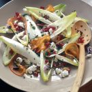 In a small bowl, stir together the cheese and the 1/2 tsp. olive oil. Add the cheese, pomegranate seeds, persimmons, pistachios and chives to the bowl with the endive.