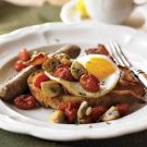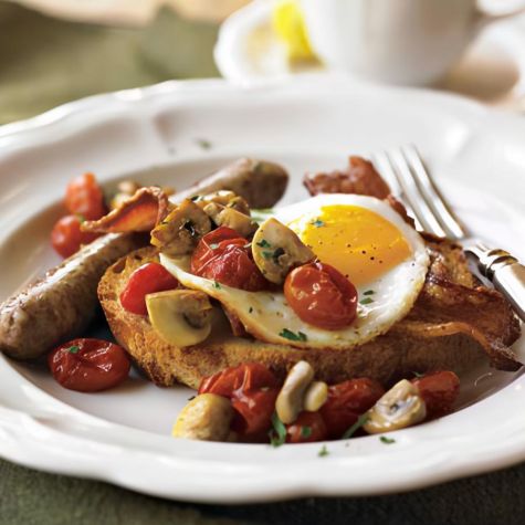 To serve, place 1 slice toast on each of 4 plates and top each with 2 fried eggs. Place the bacon and sausage on the plates. Stir together the mushrooms and tomatoes and spoon on top of the eggs. Garnish with parsley and serve immediately. Serves 4.