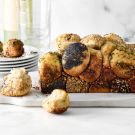 In this fun spin on a brunch favorite, we coat small balls of pizza dough toppings traditionally used on bagels, then stack them in a bread pan. The rolls bake together into a single savory loaf, ready to be pulled apart and enjoyed warm, slathered with cream cheese—just like you would a bagel. The bread will be a hit at your next brunch and makes a great accompaniment to soups and salads. You can prepare the pizza dough from scratch or, for a smart shortcut, purchase ready-to-use dough from the supermarket or your favorite pizzeria.