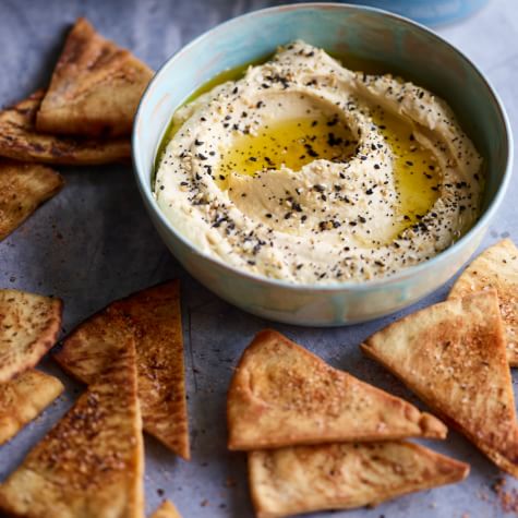 Bake until the chips are golden brown and crispy, 12 to 15 minutes. Remove from the oven and immediately transfer the chips to a wire rack to cool. Serve the chips slightly warm or at room temperature with the hummus. Serves 4.