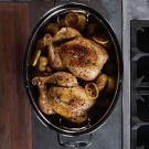 Increase the oven temperature to 450°C (230°C) and remove the lid from the roaster. Continue roasting the chickens until a thermometer inserted into the thickest part of the thighs, away from the bone, registers 160°F (71°C), about 30 minutes more.