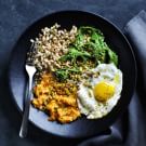 Chock-full of superfoods, this hearty grain bowl makes a satisfying meatless main course. It’s rich with protein thanks to the farro, quinoa, eggs and two kinds of seeds. The farro and quinoa need to be cooked separately, but if you want to streamline prep, feel free to swap in an equal quantity of your favorite grain mixture, or just use 1 cup of farro and omit the quinoa. To make this vegetarian dish vegan, omit the egg and use a milk alternative in the sweet potato mash.