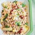 In a large bowl, whisk together the vinegar and olive oil (or a mixture of the tomato oil and olive oil). Add the farro, tomatoes, artichoke hearts, onion, parsley and pine nuts and toss gently to mix and coat well. Season generously with salt and pepper. Serve immediately. Serves 4 to 6.