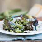 In a bowl, mix together the fava beans, olive oil, to taste, and green onion. Season with salt, pepper and lemon juice. Tear the lettuce into bite-size pieces and add to the bowl. Toss gently.