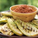Fennel is a strong licorice-flavored herb that mellows in intensity when grilled. Romesco sauce is a versatile Spanish condiment for many grilled foods, including vegetables and fish.