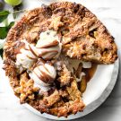 Place the pie dish on a baking sheet. Bake until the crust is golden brown, about 1 hour; check the pie after 30 minutes and cover the top and edges with foil if they become too dark. Let the pie cool on a wire rack for at least 2 1/2 hours before serving. Warm the reserved caramel sauce and serve alongside the pie for drizzling. Serves 8.