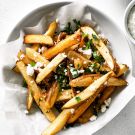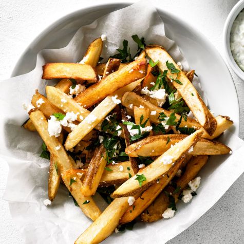 Here we put a Greek spin on traditional French fries by tossing them with tangy and pleasantly salty feta cheese. If it’s available, you can swap in aged mizithra cheese instead. A whey cheese made from sheep’s or goat’s milk, mizithra has been produced on the island of Crete for thousands of years. We prepare the fries using the cold-fry method: The potato slices are placed in a pot and covered with cold oil, then brought to a boil. This cooks the fries from the inside out, producing a wonderfully creamy interior and a crisp, golden brown exterior. These fries make a great accompaniment to Greek gyros and other sandwiches as well as American burgers, of course.