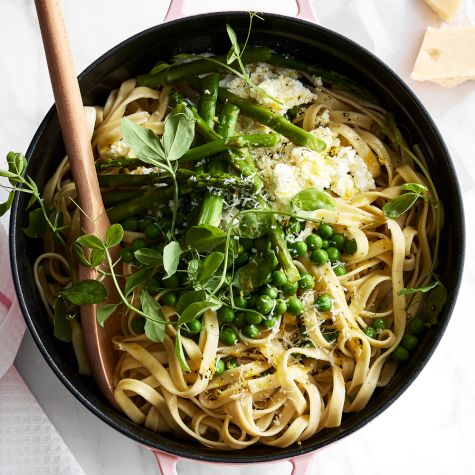 A wonderful way to welcome the new season, this easy pasta recipe showcases a medley of fresh spring vegetables, including peas three ways: sugar snaps, English peas and pea shoots, which are the delicate tendrils of the pea plant. Ricotta cheese lends richness to the dish, while lemon zest and juice brighten the flavors. If you like, you can substitute dried fettuccine for the fresh, cooking it according to the package instructions.