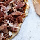 Here, sweet and salty ingredients come together to create a fantastic pizza topping. To make the fig preserves easier to spread, warm them briefly. The recipe was created for the Breville pizza maker. To bake the pizza in a standard oven, place a pizza stone in the oven and preheat the oven to 500°F (260°C). Roll out the dough as directed below, but don’t prick it with a fork. Add the toppings and bake on the pizza stone for 10 to 12 minutes.