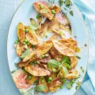 Adding spring peas and mint leaves puts a fresh spin on this warm potato salad that’s perfect for serving in spring. Try it alongside your Easter ham or a roasted rack of lamb.