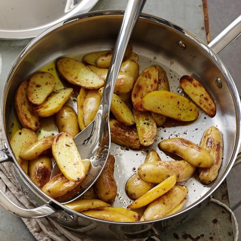 Try this simple two-step method for cooking potatoes on the stovetop: simmer them in salted water until tender, then brown with a little olive oil in the same pan. A final toss with pesto adds a wonderful dimension of herbal flavor. Serve the potatoes alongside our filets mignons and corn, tomato and arugula salad.