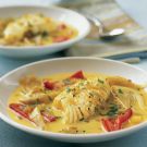 Using a slotted spoon, place a piece of fish in the center of each warmed wide, shallow bowl. Lift the vegetables from the pot and divide evenly among the bowls. Ladle 1 cup of the broth from the pot into a small bowl. Whisk in the sour cream until combined. Pour this mixture back into the pot, stirring gently. Ladle as much of the broth into each bowl as desired. Garnish with the mint and serve immediately. Serves 4.