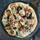 On a lightly floured surface, roll out half of the dough into a 10-inch (25-cm) round. Prick the dough all over with a fork. Transfer the dough to a floured pizza peel. Brush the dough with olive oil and top with half each of the pear, figs and blue cheese, leaving a 1/2-inch (12-mm) border uncovered.