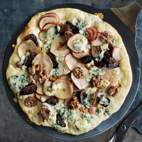 On a lightly floured surface, roll out half of the dough into a 10-inch (25-cm) round. Prick the dough all over with a fork. Transfer the dough to a floured pizza peel. Brush the dough with olive oil and top with half each of the pear, figs and blue cheese, leaving a 1/2-inch (12-mm) border uncovered.