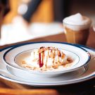 To serve, spoon the crème anglaise into a dessert bowl or soup bowl to about 1/2-inch depth. Place a meringue on top of the sauce, drizzle caramel over the meringue and top with toasted almonds. Repeat with the remaining ingredients and Serve immediately.
