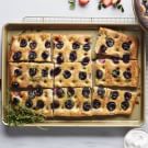 Bake until the focaccia is deep golden brown all over and the cherries have collapsed slightly, 20 to 25 minutes; halfway through baking, lightly drizzle the dough with more olive oil.
