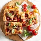 Topped with juicy tomatoes and plenty of aromatic basil, this savory focaccia is perfect for summer celebrations. Serve as a main course along with a big green salad, or cut it into small squares and serve it as an appetizer as your next outdoor gathering.