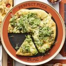 Bake until the crust is golden brown and the cheese is bubbling, about 12 minutes. Let the flatbread cool for 3 minutes, then top with a few generous dollops of the pesto. Garnish with sprouts, chives, a sprinkling of red pepper flakes and a few grindings of black pepper. Cut into slices and serve immediately. Makes one 10-inch (25-cm) flatbread.