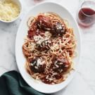 In a large saucepan over medium heat, warm the pasta sauce until heated through. Add the spaghetti and the reserved pasta cooking water and toss to coat. Add the meatballs and toss to coat in the sauce. Transfer to a serving platter and top with shaved Parmesan. Serve immediately. Serves 4.
