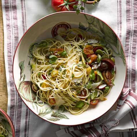 Wait until tomatoes are at their peak before making this light, summery dish, in which uncooked tomatoes are gently warmed by fresh pasta. Using top-notch olive oil and authentic Parmigiano-Reggiano cheese are also key to the dish’s success.