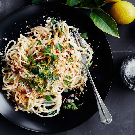 Add the pasta to the boiling water and cook until al dente, 2 to 3 minutes. Drain, reserving 1/2 cup (4 fl. oz./125 ml) of the pasta cooking water. Add the pasta to the sauce and toss, adding the reserved pasta cooking water as needed to achieve a silky consistency. Add the bread crumbs, parsley, red pepper flakes and salt to taste. Toss to combine and serve immediately. Serves 4.