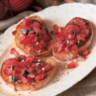 Bruschetta can be made with different toppings, the simplest being a rub of garlic and a drizzle of extra-virgin olive oil. This version, which demands summertime's finest vine-ripened tomatoes, is one of the best. A bit of balsamic vinegar brings out the sweetness of the tomatoes. You can also add some chopped garlic, if you like. A thin slice of ricotta salata laid on top of the tomatoes is a nice addition and can turn this antipasto into a light lunch.