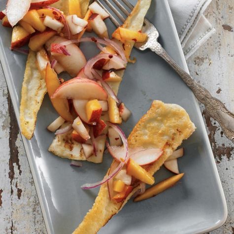 In a bowl, combine the peach, nectarines, red onion and red pepper flakes. Add the lime juice and the 1/4 tsp. salt and toss gently with a wooden spoon. Taste and adjust the seasoning with more salt, if needed. Set the salsa aside.