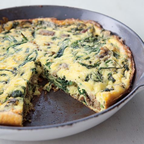 Transfer the pan to the oven and bake until the frittata is set in the center and slightly puffed, 25 to 30 minutes. Let cool for 5 minutes in the pan. Carefully run a paring knife or sharp-bladed spatula around the inside edges to release the frittata and slide onto a large plate. Cut the frittata into wedges and serve warm or at room temperature. Serves 8.