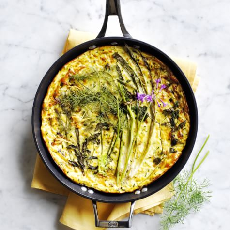 Whether you’re looking for an easy brunch dish or a low-stress supper at the end of a busy day, a frittata fits the bill. The options for fillings are endless and can change with the seasons. This recipe is perfect for summer, when zucchini are plentiful. Feta cheese lends a salty tang, while a shower of herbs adds a fresh note. To make cooking easy, we use a frittata pan, which features two interlocking pans that facilitate flipping the egg dish.