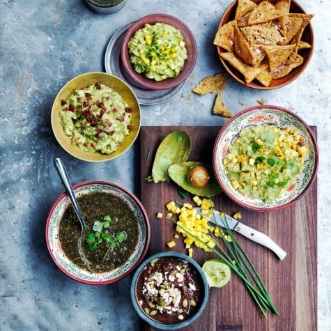 To serve, pour the salsas into separate serving bowls. Serve all four guacamoles and both salsas with plenty of tortilla chips alongside for dipping. Serves 20.
