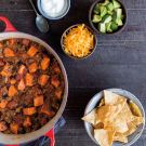Football fans know that a hearty bowl of chili is a great dish to serve when you’ve invited friends over for the game. You can make this chili a day or two in advance, and then reheat it just before kickoff. Set out the garnishes so diners can customize their own bowls, and bake a big batch of corn bread.