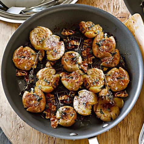 Remove the pan from the heat and smash the potatoes lightly with a spatula. Return to medium-high heat and cook, uncovered, until the potatoes are just beginning to brown underneath, about 2 minutes. Add the garlic and thyme and cook, stirring constantly, until fragrant, about 1 minute. Adjust the seasoning with salt and pepper. Serve immediately. Serves 2 to 4.