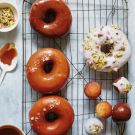 Dip the doughnuts, one at a time, into the warm glaze, covering the top half of each doughnut with glaze. Place the doughnuts, glazed side up, on the wire rack and let the glaze set for 10 minutes. Repeat to glaze the doughnut holes. Serve immediately. Makes about 14 doughnuts and doughnut holes.