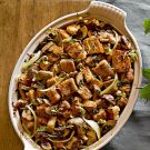 Transfer the stuffing to the prepared baking dish. Cover with a lid or a buttered sheet of aluminum foil and bake for 20 minutes. Remove the lid or foil and continue baking until the top is golden brown and crisp, 25 to 35 minutes more. Let rest for 10 minutes before serving. Serves 10 to 12.