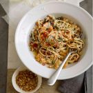Drain the pasta, reserving 1/2 cup (4 fl. oz./125 ml) of the cooking water, and return the pasta to the pot. Add the cauliflower, lemon juice, parsley, capers, Calabrian chiles and the reserved cooking water and stir to combine. Stir in the bread crumbs and cheese and taste, adjusting the seasoning with salt and pepper if necessary. Garnish with additional Calabrian chiles to taste and serve immediately. Serves 4.