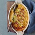 Michael Sullivan, Butcher at Blackberry Farm, says this dish was inspired by a corn pudding that his grandmother made. He adds guanciale, an unsmoked Italian bacon made from the pig’s jowl, to the batter before baking, although thick-cut bacon is a great stand-in. When fresh corn is in season, you can fold in kernels cut from the cob; they lend wonderful texture and flavor. If you’d like, place a few whole green onions on top of the batter before baking.