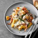 At Frenchette, a critically acclaimed French brasserie in New York City’s Tribeca neighborhood, chef/owners Lee Hanson and Riad Nasr serve a unique version of gnocchi Parisienne. This rich dish features dumplings made from pâte à choux, or choux pastry, that are finished in brown butter. At Frenchette, the gnocchi are then topped with slivers of ham and a creamy, cheesy Mornay sauce. The chefs pipe the gnocchi dough with a piping bag into boiling water, but we found it was easier to roll the dough into long cylinders, cut it into 1-inch (2.5-cm) lengths and add the gnocchi to the water. The recipe calls for jambon de Paris, a Parisian-style ham that has been lightly wet-cured and boasts a delicate taste.
