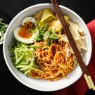 Reminiscent of the spicy Korean cold noodle dish called bibim naengmyeon—served with buckwheat noodles, fresh produce and a boiled egg or beef—this colorful noodle dish makes quick work of dinnertime. Pickle the zucchini and boil the eggs ahead of time, and all you’ll have to do à la minute is slice the produce, boil the noodles and toss with our sweet-tangy Gochujang Noodle Sauce. Choose an early Asian pear variety that’s underripe, as the crisp texture and sweet flavor add balance and depth to the dish.