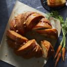 Transfer the pan to a wire rack and let cool for 30 minutes, then invert the pan onto the rack and lift off the pan. Let cool completely, about 2 hours, before serving. Drizzle the cake with honey, garnish with candied orange peel and dust with cinnamon. Garnish each slice with shaved carrots. Serves 16.