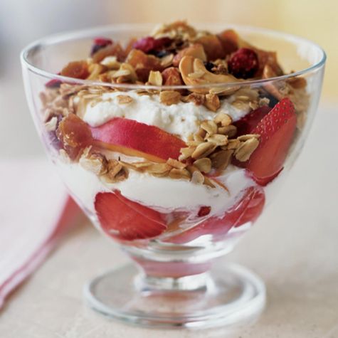 With a batch of granola ready, it takes only minutes to prepare this easy breakfast dish. You can substitute whole blackberries or blueberries for the strawberries and sliced peaches for the nectarines.
