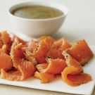 Uncover the salmon and scrape off the lemon slices and most of the peppercorn mixture. Using a thin, sharp knife, cut the salmon on the diagonal into very thin slices. Lift the slices from the skin and arrange on a serving platter. The salmon may be sliced up to 6 hours ahead and refrigerated, tightly covered, until serving. Garnish with lemon slices and serve with the sauce. Serves 10 to 12.