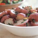 The variety of potato salads found across Greece proves the popularity of this dish. In many versions, potatoes are tossed with a red wine vinaigrette, as they are here. The potatoes soak up the dressing and the salad is served warm. The addition of capers, coriander, parsley and lemon zest gives the salad a pleasantly citrusy, salty flavor.