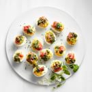 First, make the deviled eggs. How to boil the perfect egg: Completely submerge the eggs in a saucepot filled with cold water. Bring to a boil, then immediately turn off the heat and cover. Set a timer for 8 minutes and let stand, covered, until the timer goes off. Immediately pour out the hot water and fill the pot with ice. Let sit for 5 minutes before peeling.