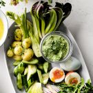 Redolent of fresh herbs, this dip is inspired by the classic green goddess salad dressing. The chef at San Francisco's Palace Hotel created the dressing in the 1920s to honor actor George Arliss, who was performing locally in a play called Green Goddess. Here, we serve the dip with crudités—celery, komatsuna, mustard greens, romaine hearts, cucumber and pommes persillées—as well as soft-cooked eggs. However, this dip also makes a great spread for sandwiches and a fresh dressing for salads.