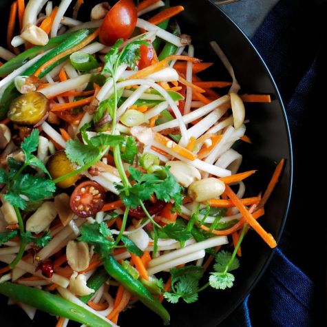 Add the dressing to the vegetables and toss to combine. Season with salt to taste. Transfer to a serving bowl and garnish with the green onions, cilantro leaves and roasted peanuts. Serve immediately. Serves 4.