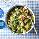 Pasta salads often get a bad rap for being rather ho-hum. But not this version. It’s packed with loads of fresh herbs and crispy fried chickpeas. To tie the salad together, we toss it with our bright-tasting green tahini—a far cry from the typical heavy, mayo-based dressings. We combine tahini, the Middle Eastern sesame seed paste, with lemon juice, olive oil, green onions, garlic and more herbs. Then the salad is finished with chunks of creamy feta cheese for a touch of richness and salty tang.