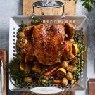 Transfer the chicken to a carving board, cover loosely with aluminum foil and let rest for 10 minutes. Transfer the potatoes and carrots to a platter. Carve the chicken, arrange on the platter and serve immediately. Serves 4 to 6.