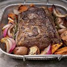 Place the roast, fat side down, in the pan and sear until well browned, 1 1/2 to 2 minutes. Turn the roast over and sear for 1 1/2 to 2 minutes more. Turn off the center burners and reduce the outside burners to medium-high. Place the vegetables along the sides of the pan and lay the rosemary sprigs on top.